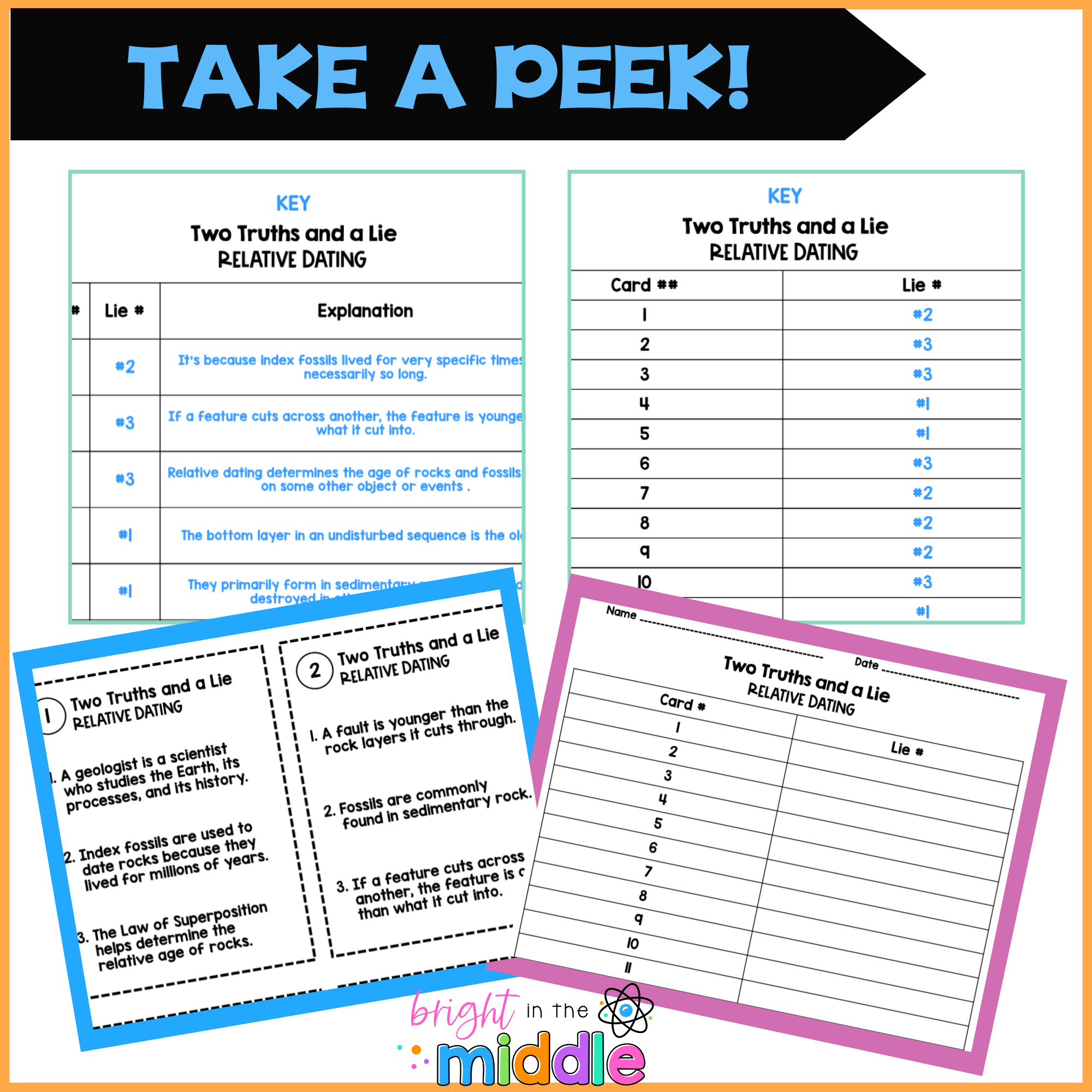 This is a relative dating activity students will love! This Two Truths and a Lie activity challenges students to read three short science statements, decide which two are true, and identify the “lie.” Along the way, they’ll practice using evidence, applying vocabulary, and thinking critically about Earth Science concepts like rock layers, fossils, and geologic processes.