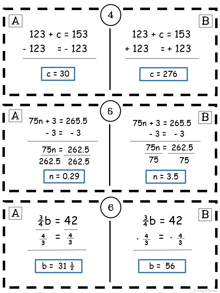 ★ Students should look through sides A and B on each card. One equation is solved correctly, while the other has a “common mistake”.