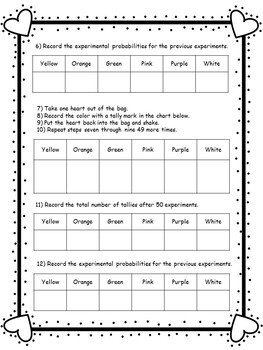 Students will first find the theoretical probability of choosing each color of the Valentine’s candy heart, then they will find the experimental probability when choosing 20 hearts, then 50, and then 100. Reflection Questions are included!